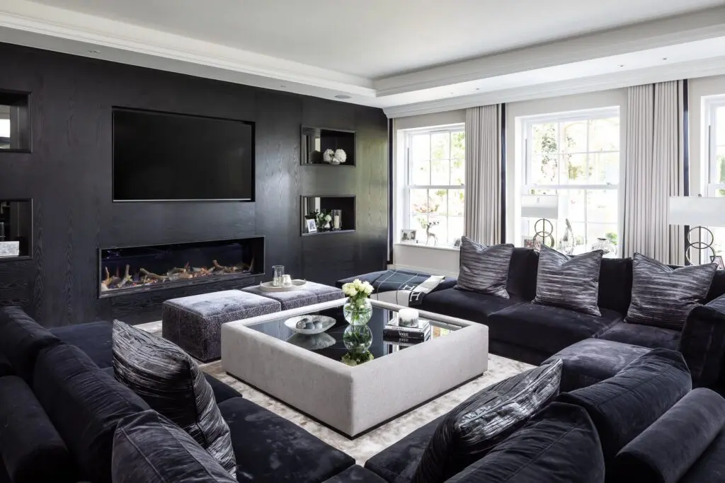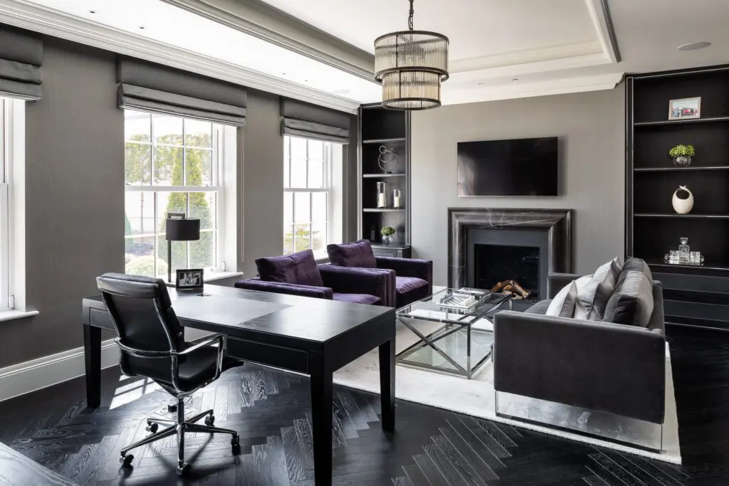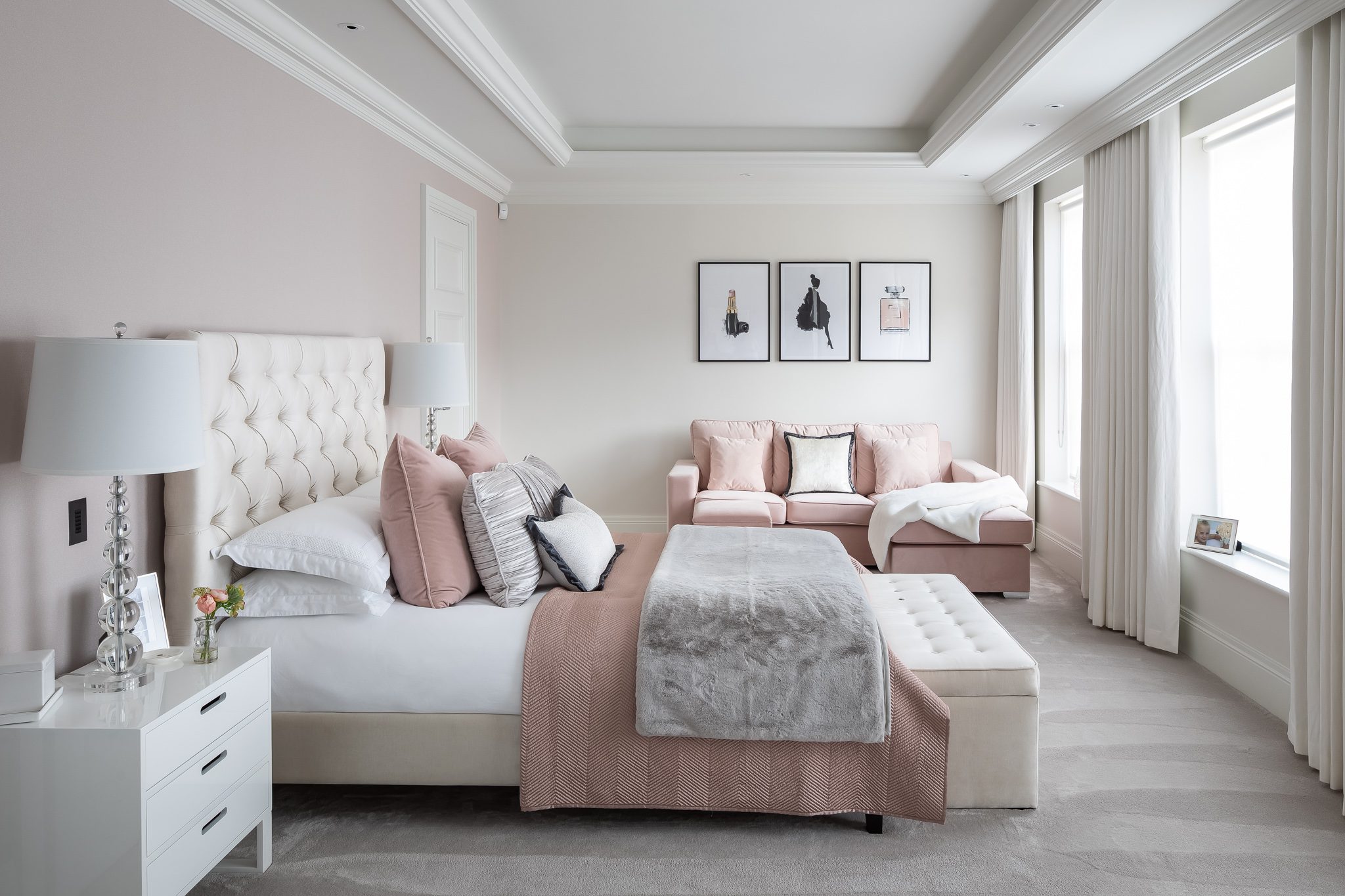 This scheme focused on manually operated window treatments, including roman blinds, curtains, and roller blinds, with curtain tracks discreetly concealed behind coving and bespoke handmade pelmets to maintain a clean and polished look.
